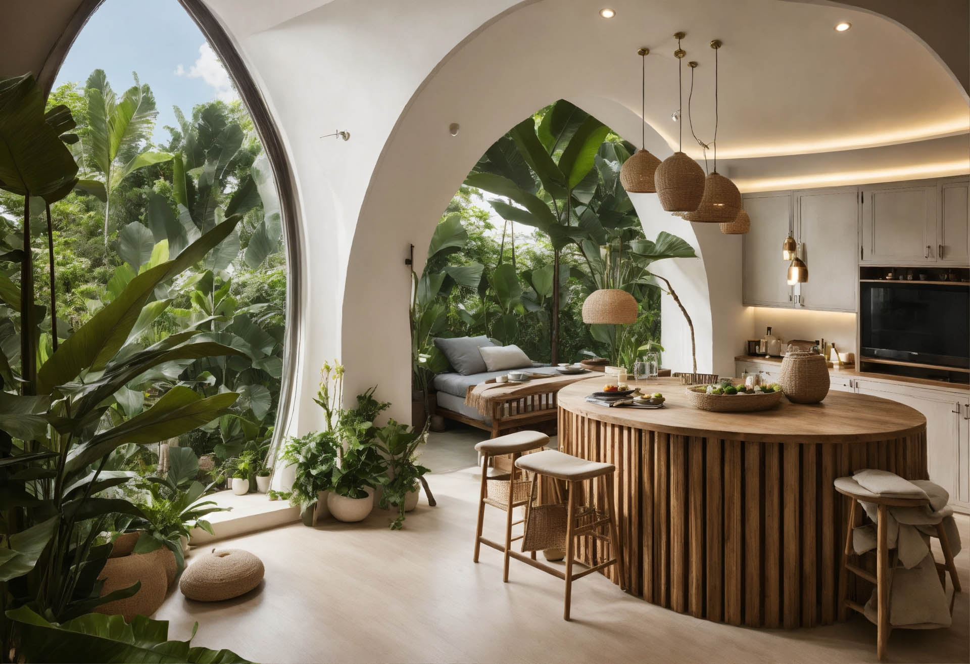 The implementation phase focuses on bringing the rustic elegance concept to life. The living room features a large, distressed leather sofa, a reclaimed wood coffee table, and a stone fireplace. The kitchen showcases custom cabinetry with a vintage finish, a farmhouse sink, and high-end appliances. The bedroom is designed with a four-poster bed, plush textiles, and a cozy reading nook. The bathroom includes a freestanding tub, a wooden vanity, and elegant fixtures, providing a luxurious retreat with a rustic touch.